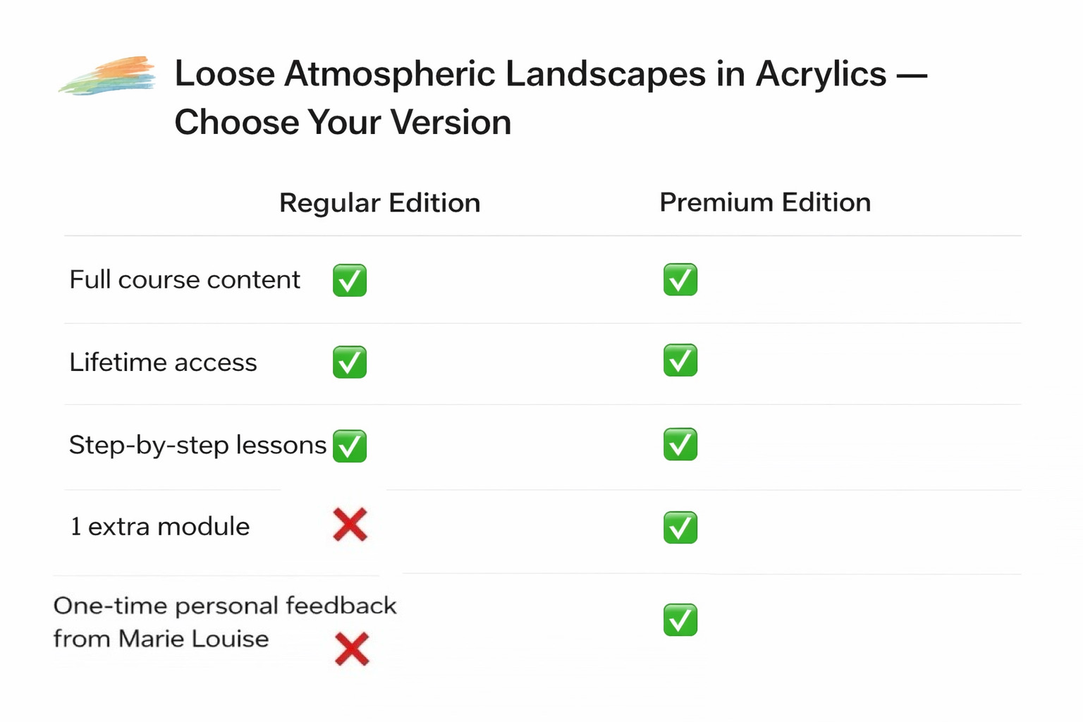 PREMIUM EDITION: Includes two additional modules: "Create a Splash with Acrylic ink" and "From Sketch to Finished Painting" + Custom Feedback on your artwork.