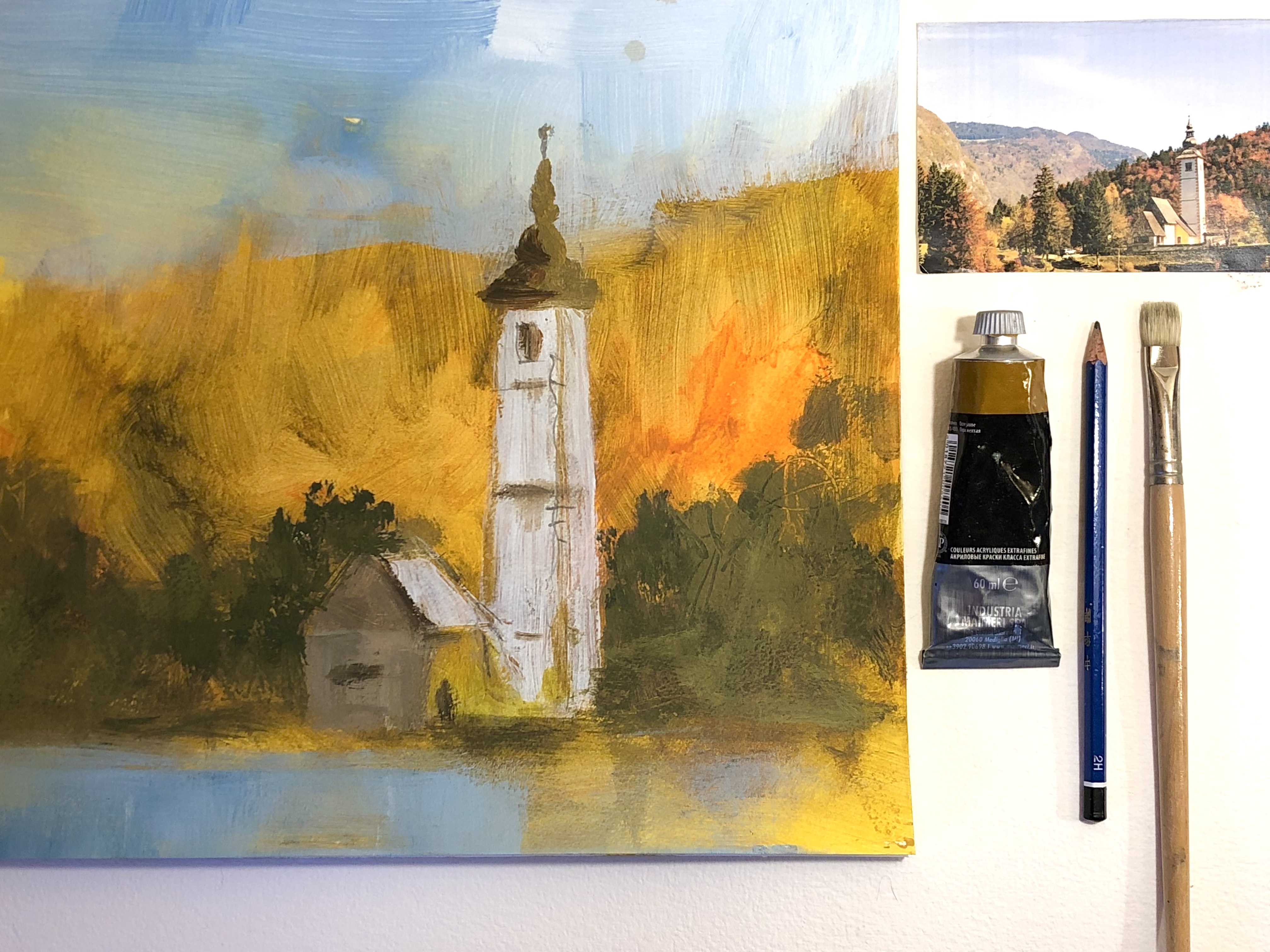 In this lesson you will learn how to abstract a detailed mountain landscape with trees, a lake, boats and buildings. You will learn to choose what to leave in and what to take out. Welcome to: Sanctuary in the Autumn Hills